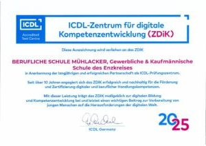 Der Computerführerschein ICDL (die Abkürzung steht für „International Certification of Digital Literacy“) ist der internationale Standard für die Entwicklung digitaler Kompetenzen. Mit über 16 Millionen Teilnehmenden und über 50 Millionen ICDL-Tests ist er weltweit in über 100 Ländern als Nachweis von Computerkenntnissen anerkannt. Bereits seit dem Schuljahr 2008/2009 ist die Berufliche Schule Mühlacker in Trägerschaft des Enzkreises eines der über 1500 Prüfungszentren in Deutschland und der über 30 000 Trainingszentren weltweit.